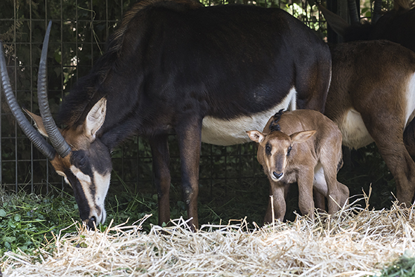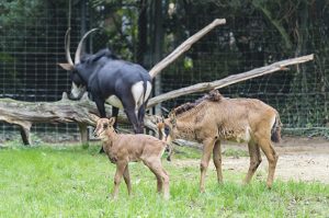 Bei den Rappenantilopen brachte am 27. August die 11 jährige Mutter Ena ein Junges zur Welt, Ena ist eine sehr erfahrene Kuh und macht auch mit diesem Jungen alles richtig. Der vierjährige Vater der kleinen Antilope Felix interessiert sich nicht allzu sehr für seinen Nachwuchs aber auch Ena ist nicht oft bei dem kleinen. Das ist aber ganz normal, denn in der Wildnis bleiben die jungen Rappeantilopen in den ersten Wochen geschützt irgendwo liegen – sie können in dieser Zeit gar nicht richtig gehen. Da die jungen bewegungslos liegenbleiben und in dieser Zeit auch keinen Eigengeruch haben werden sie von Jägern kaum entdeckt und haben so eine gute Überlebenschance. Das Fell einer Rappenantilope verändert sich mit dem Alter, wobei nur die Böcke ein richtig schwarzes Fell bekommen. Die ganz jungen Tiere haben ein hellbraunes Fell, das sich mit dem Alter dunkler färbt. Das ist alles gut so von der Natur eingerichtet damit die schönen Tiere die beste Tarnung haben. Die Hörner aller