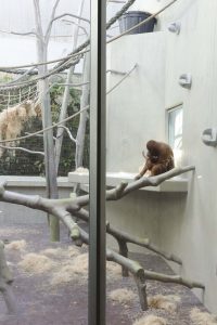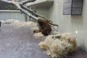 Bereits 20 Tage vor dem Rappenantilopenkalb, kam am 7. August bei den Orang-Utans „Padma“ (indonesisch für Wasserlilie) die Tochter von Maja zur Welt. Orang-Utan-Mütter sind gemäss ihrem Habitat alleinerziehende Mütter. Diese Menschenaffen leben in der freien Wildbahn alleine und dementsprechend ist es auch mit der Aufzucht der Jungtiere. Meist ist es so, dass die früheren Töchter länger bei der Mutter bleiben, die Geburt eines Geschwisters miterleben und so ein wenig über das Verhalten eine Orang-Utan Mutter lernen können. Bei Maia war es so, dass sie ihre Schwester Kila bei der Aufzucht deren Sohnes Ombak beobachten konnte und so scheint sie keine Probleme im Umgang mit Padma zu haben. Wie Kila, zeigt auch Maia ihr Junges den Pflegern von Zeit zu Zeit, sie hat sogar am Anfang das Füsschen des Padma durch die Gitter gestreckt, damit die Pflege es berühren konnten, erzählt Patrick Wieser, der im Moment die Orangs pflegt. Als Herr Wieser ein wenig Futter in den Käfig wirft kommt Maia mit Padma, die sich sehr gut im Fell der Mutter festhält sehr vorsichtig von ihrer geschützten Terrasse herunter und pickt sich die eine oder andere Leckerei auf. Dabei achtet sie enorm gut auf ihr Junges und so ist es gar nicht so einfach das kleine sehen