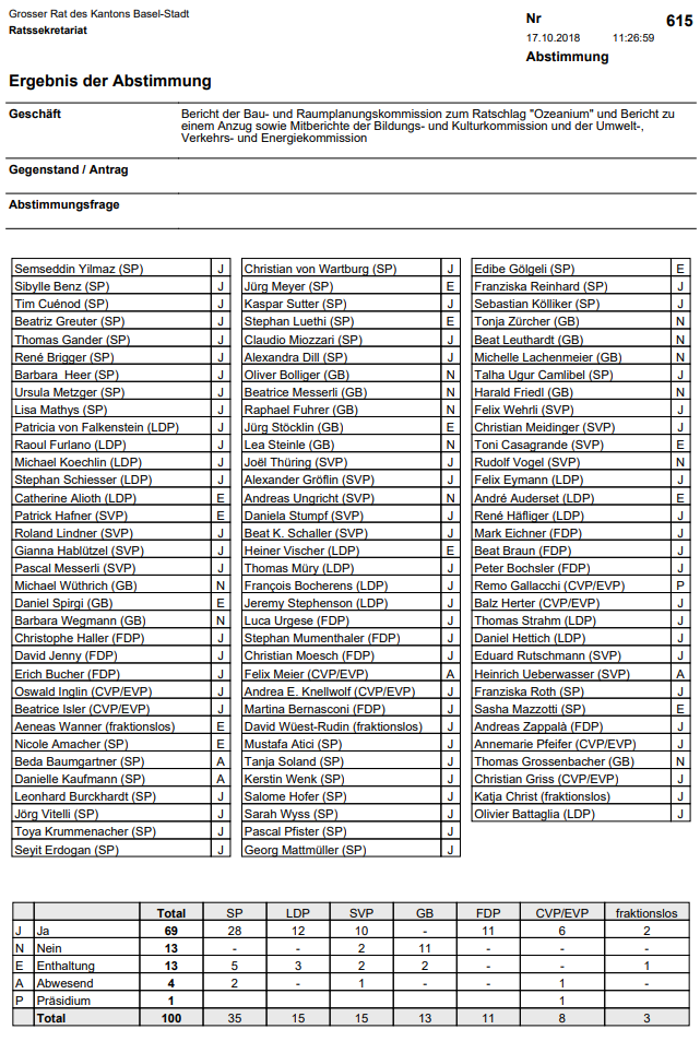 Mit 69 Ja und 13 Nein Stimmen bei 13 Enthaltungen und 4 Abwesenden also mit grossem Me(e)hr hat der Grosse Rat am 17.10.2018 dem Bebauungsplan zum Ozeanium zugestimmt. Selbst beim Grünen Bündnis gab es zwei Enthaltungen. Die gab es leider auch bei den bürgerlichen LDP (3 Enthaltungen) und SVP (2 Enthaltungen und 2 mal Nein), nur bei FDP und CVP stimmten alle Anwesenden mit Ja. Ein Referendum ist bereits angekündet.